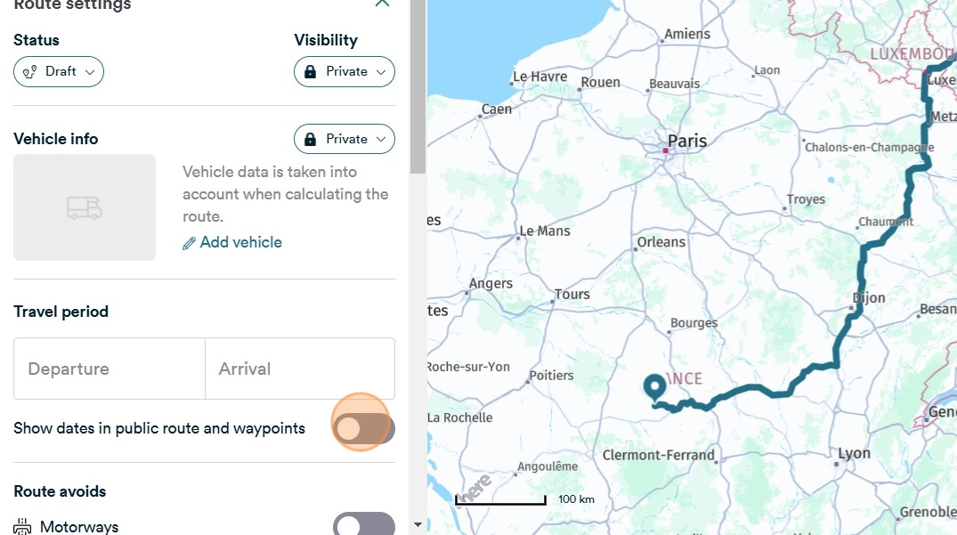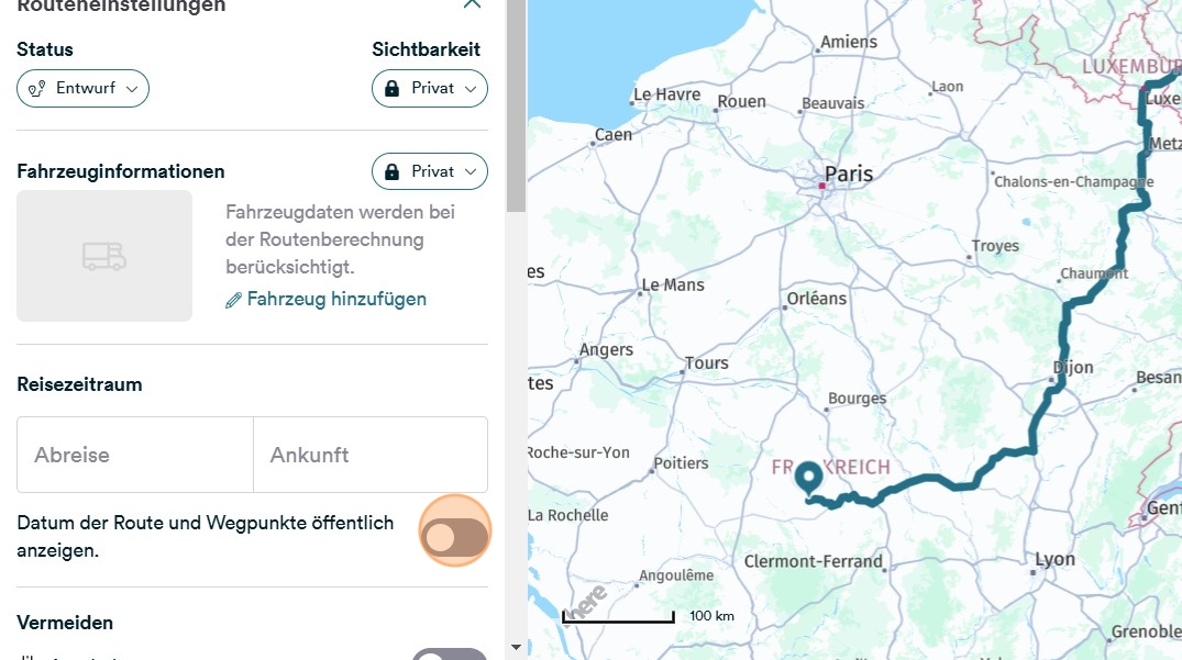 Standardmäßig wird der Reisezeitraum einer Route oder das Datum an Wegpunkten öffentlich nicht angezeigt. Sie können über die Routeneinstellungen steuern, ob diese Informationen öffentlich angezeigt werden sollen.