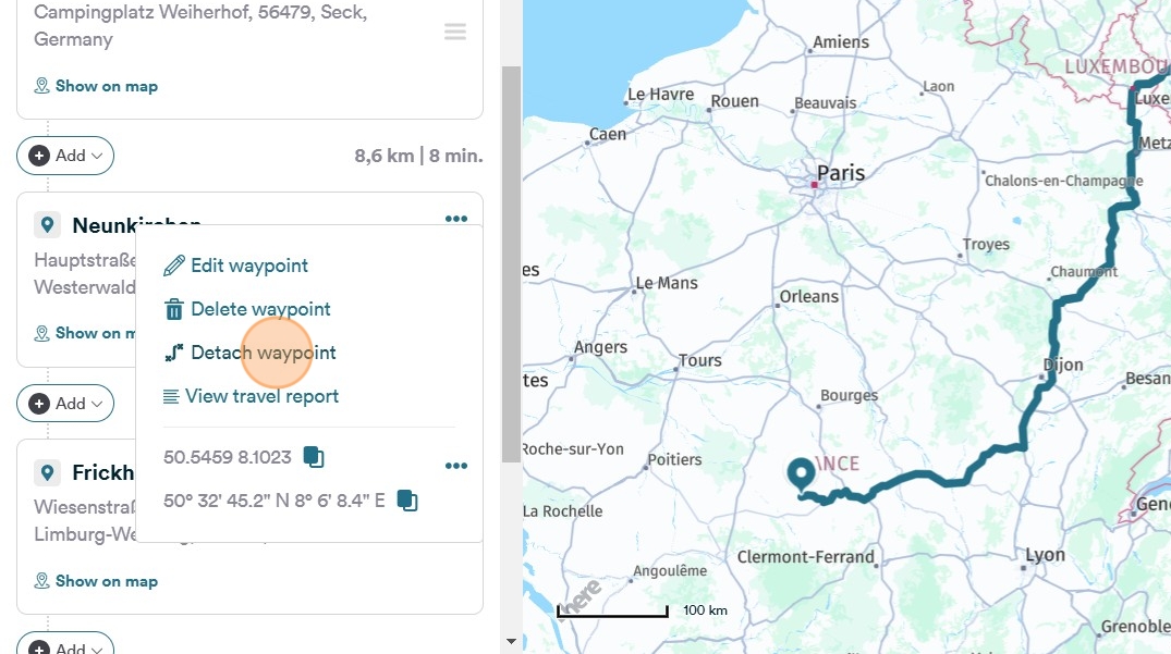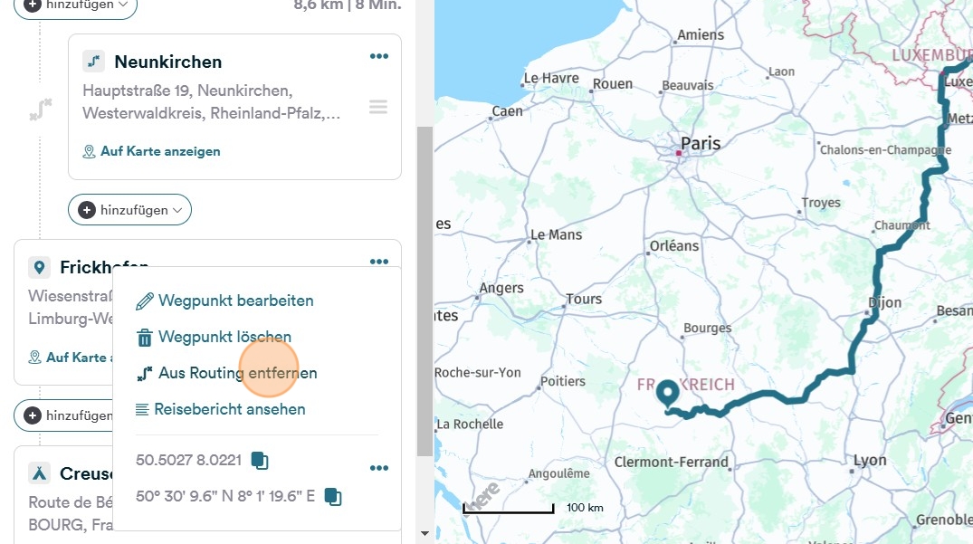 To exclude a waypoint from the route guidance, click on the three small dots next to the name of the waypoint.