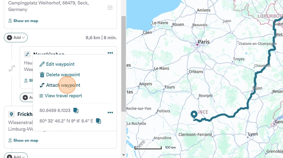 To include a waypoint back into the route guidance, click on the three small dots again and select "Attach waypoint."