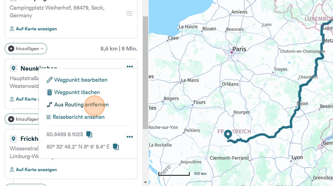 To exclude a waypoint from the route guidance, click on the three small dots next to the name of the waypoint.